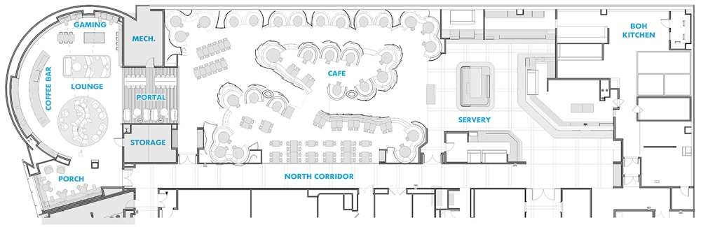 STUDIOS understood from the start that the challenge to this project was to reprogram the amenities spaces while respecting the original design. Gehry’s glass curtains and serpentine seating elements remain the centerpiece of the café. A new artisan food hall operated by Michelin Star Chef Claus Meyer provides six separate micro-restaurants and kiosks. The renovation drastically increased access to the food hall from the entry off the elevator lobby from 6’ to over 30’, no longer funneling patrons into the space and giving them space to meander. The connection between the food hall and the café was also enlarged, infusing the light and dimensionality of the Gehry glass panels across spaces.