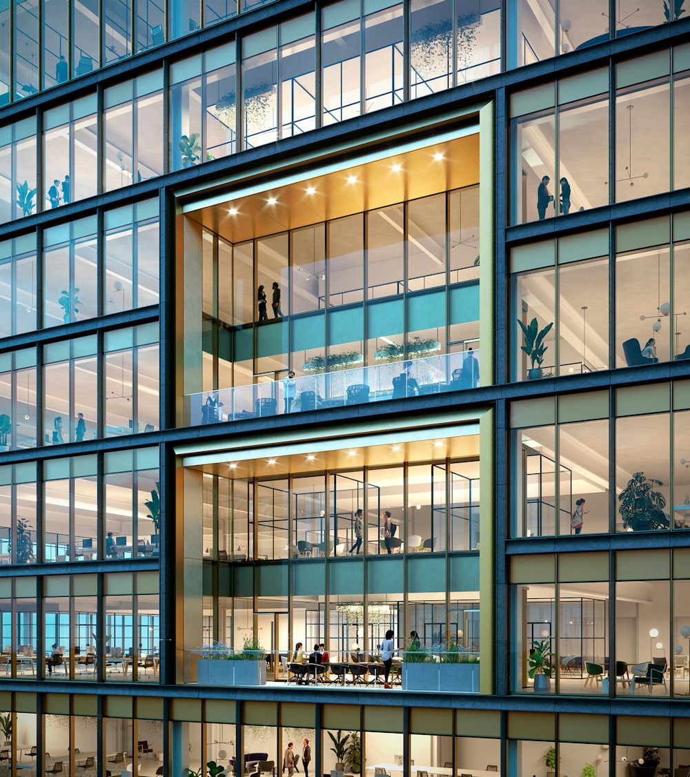 L'ensemble des plateaux sont très ouverts et les étages supérieurs offrent de nombreux accès à des espaces extérieurs avec des terrasses distribuées de façon symétrique de part et d'autre du bâtiment, créant un fronton central contemporain qui donne son identité au bâtiment. Le toit-terrasse de 1 250 m² offre une vue imprenable sur New York et la rivière Hudson.