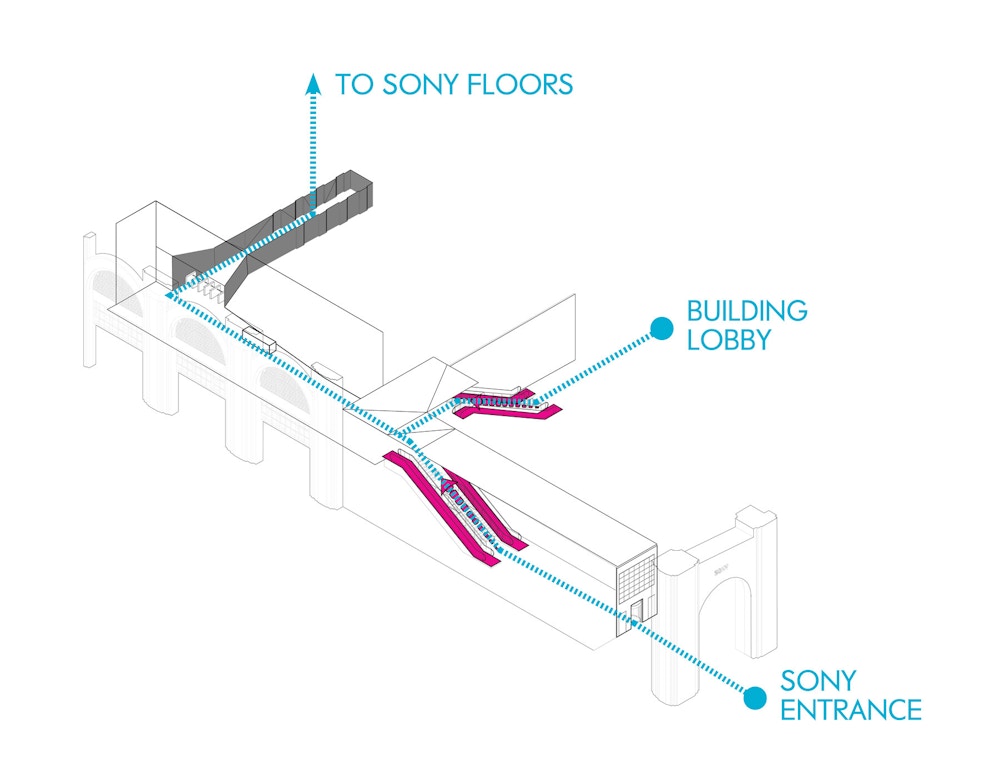 The restored historic ground floor lobby is connected to a new Sony Sky Lobby by a monumental stair, flanked by two escalators. A clean, white and modern aesthetic sets the stage for Sony’s modern workspace in the stack above. Larger-than-life video screens in the ground and sky lobbies immerse visitors and employees in the Sony experience even before getting to the elevators.