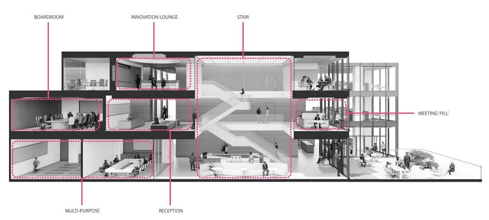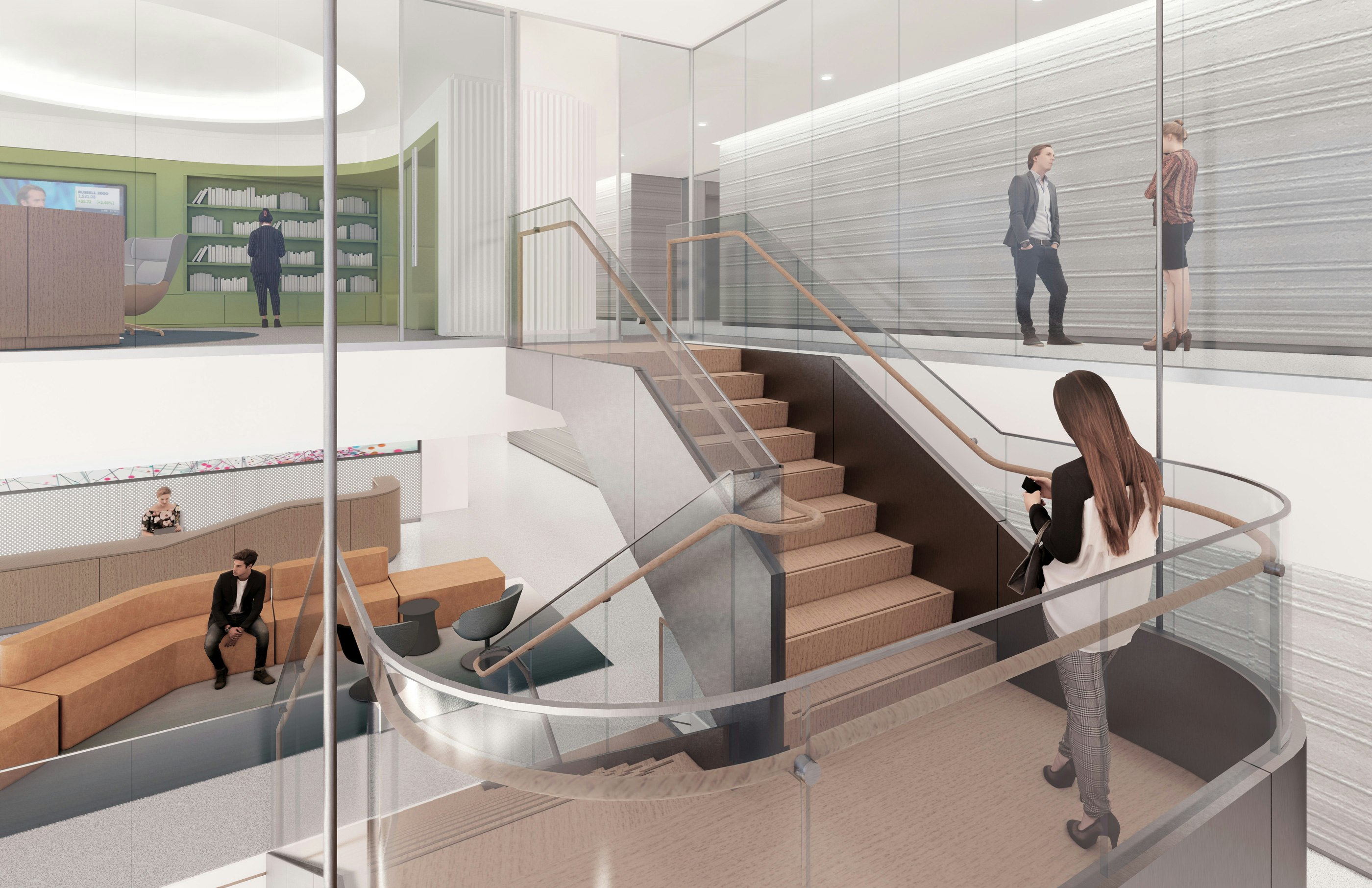 STUDIOS’ design revolves around an interactive “hub,” a central gathering space to include a staffed barista, grab & go food, informal conference spaces, innovation library, and reception. With an interconnecting stair, the hub will be one of the main focal points of the office, encouraging employees to circulate the floors and increasing interaction among staff.