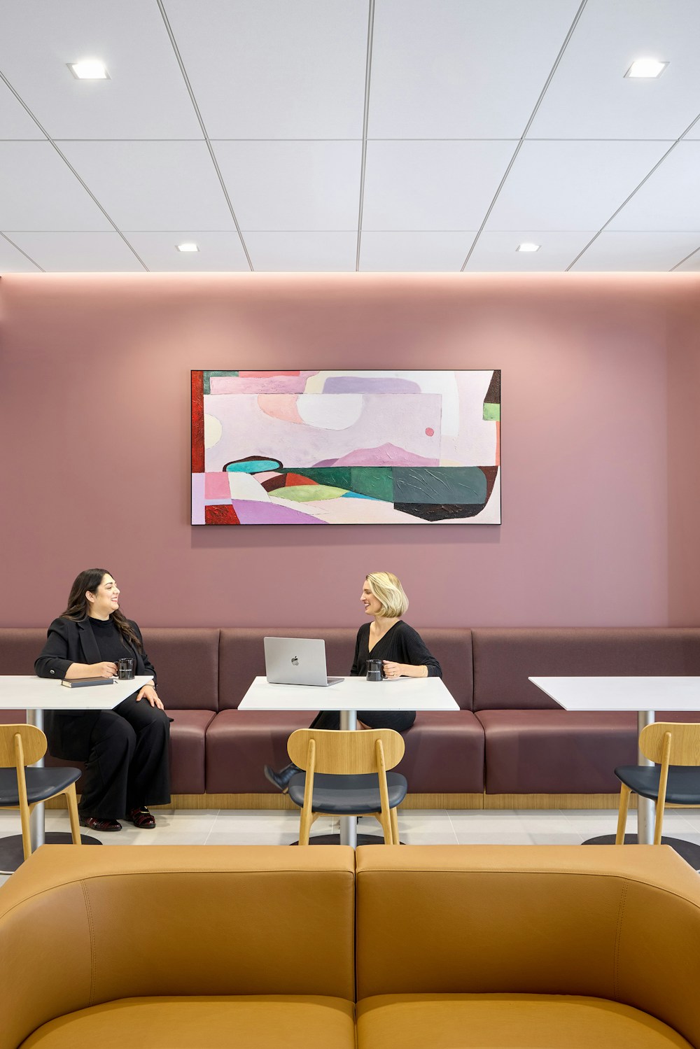 The eastern side of the floor houses the public-facing programmatic spaces including main reception, meeting, and lounge.. A striking mural pays homage to the nearby salt flats in San Francisco Bay, capturing the ethereal, wide-open vistas and soft, warm tones of the landscape. Grouped together, these communal spaces create a front of house to receive clients and visitors for intimate discussions and large events.