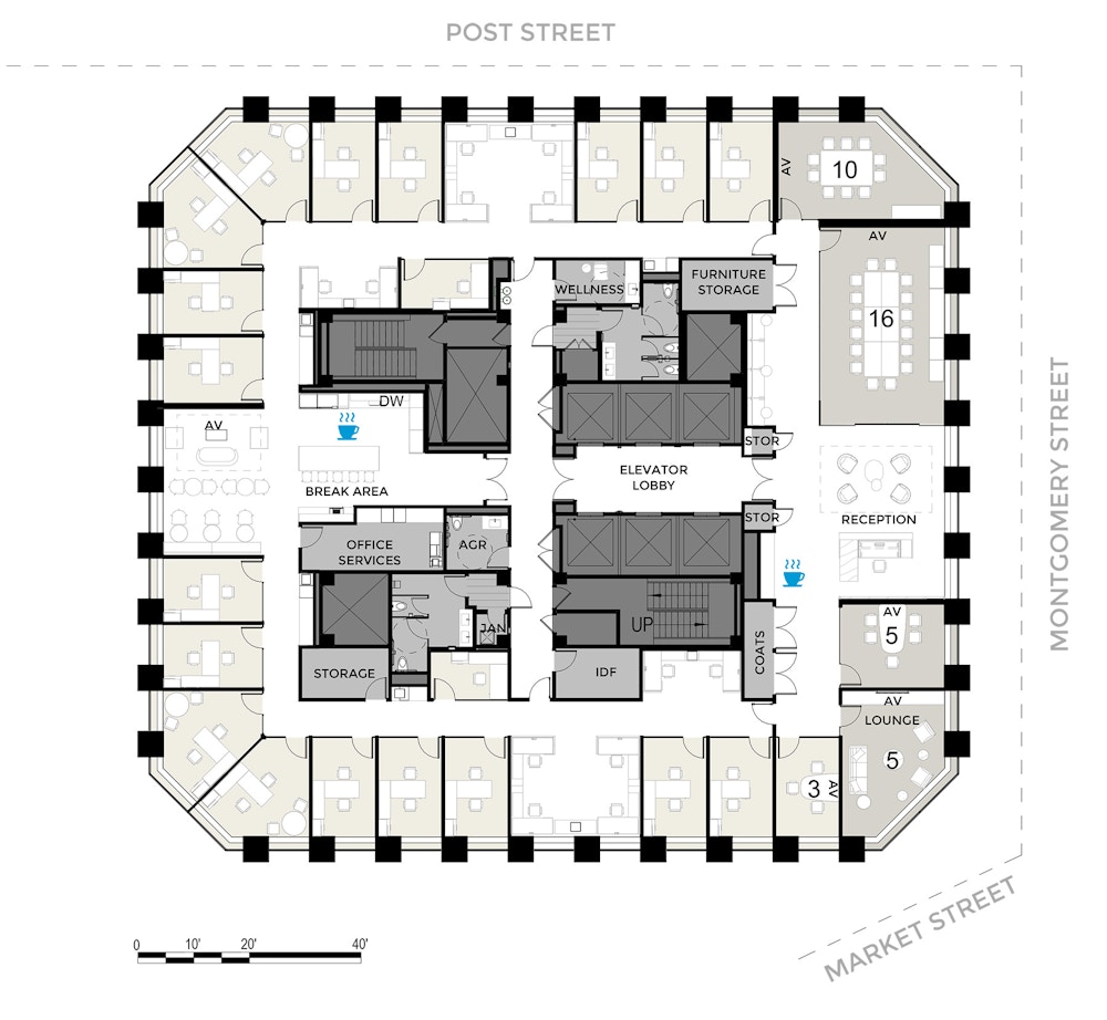 Planned for efficiency, key work spaces line the remaining perimeter of the floor. Open workstations for support staff are centralized between private attorney offices. This allows easy access for partners, while offering opportunities for collaboration and mentorship. The layout emphasizes a balance between functionality and comfort, with each workstation ergonomically designed to meet the needs of employees, and providing stunning views and natural light for all. In alignment with the reception on the east side of the floor, the pantry and breakroom are central to the west side of the floor.