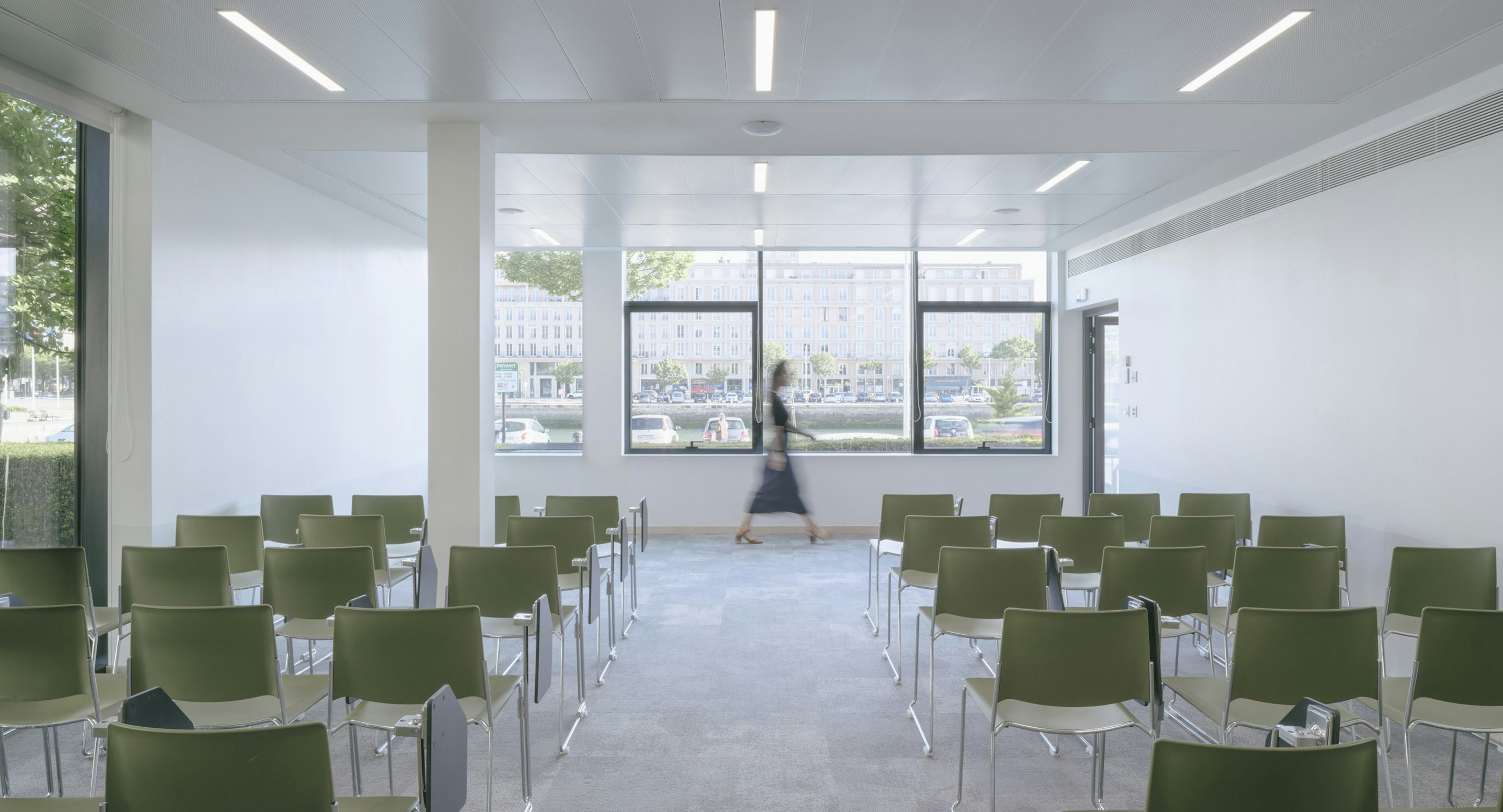 The building’s 500 m² now host the LiVE training campus, fully reconfigured with a ground-floor reception, four classrooms for up to 60 people, an open library, and administrative offices. Two stairwells and an elevator connect the basement, which houses a communal kitchen and faculty room.