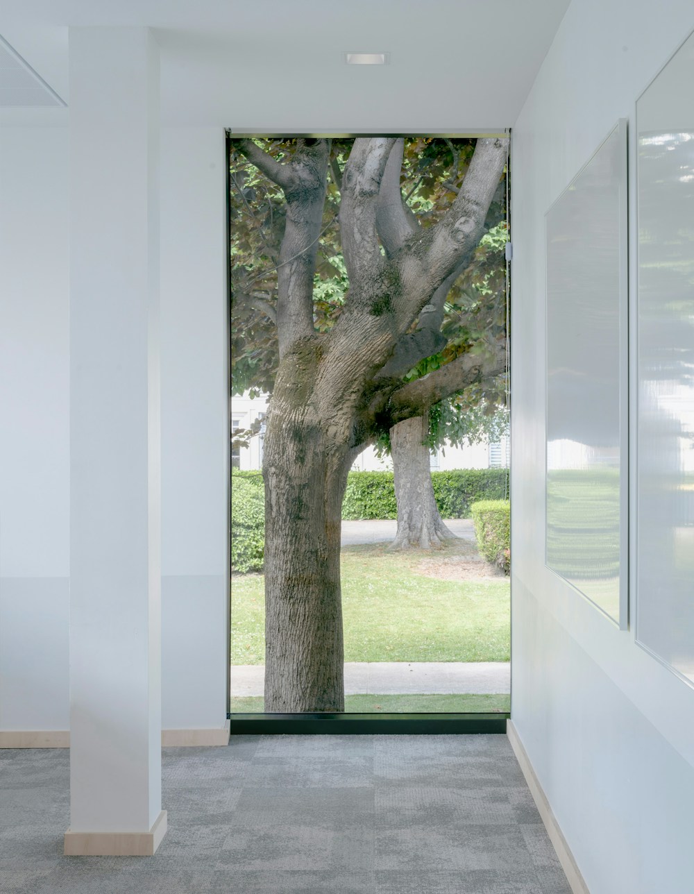 Full-height curtain walls define the East and West façades, while the North and South façades feature exterior frames on solid spandrels. Extra-thin aluminum profiles form a precise 1.5-meter grid, housing VEC – Verre Extérieur Collé glazed openings, each framed like a painting with recessed joints.