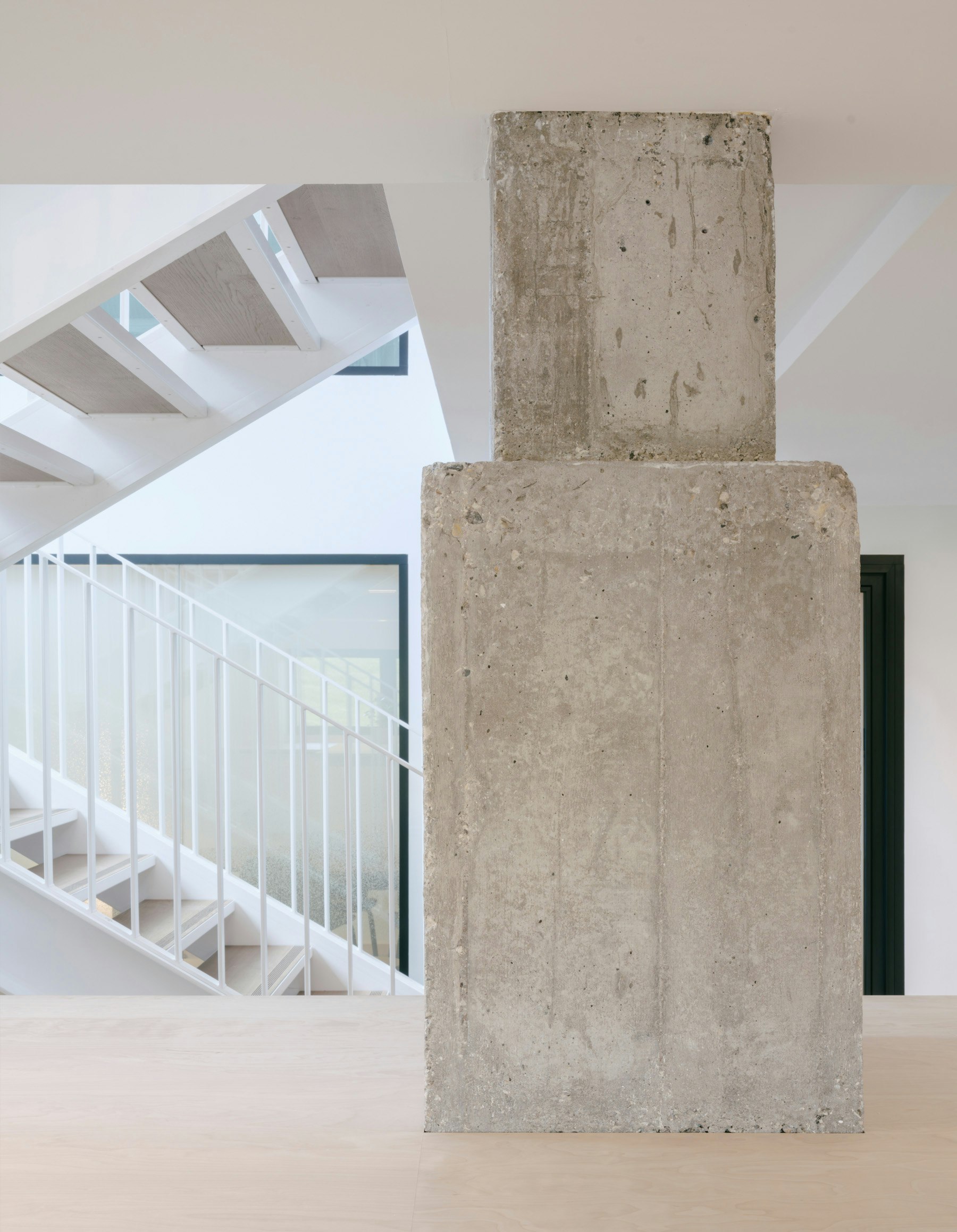 The original structure guides the interior layout: concrete plinths and columns have been transformed into suspended tables and work surfaces, while stairwells appear to float. Wood accents warm the reinforced concrete, creating a modern, inviting environment that honors the building’s heritage.