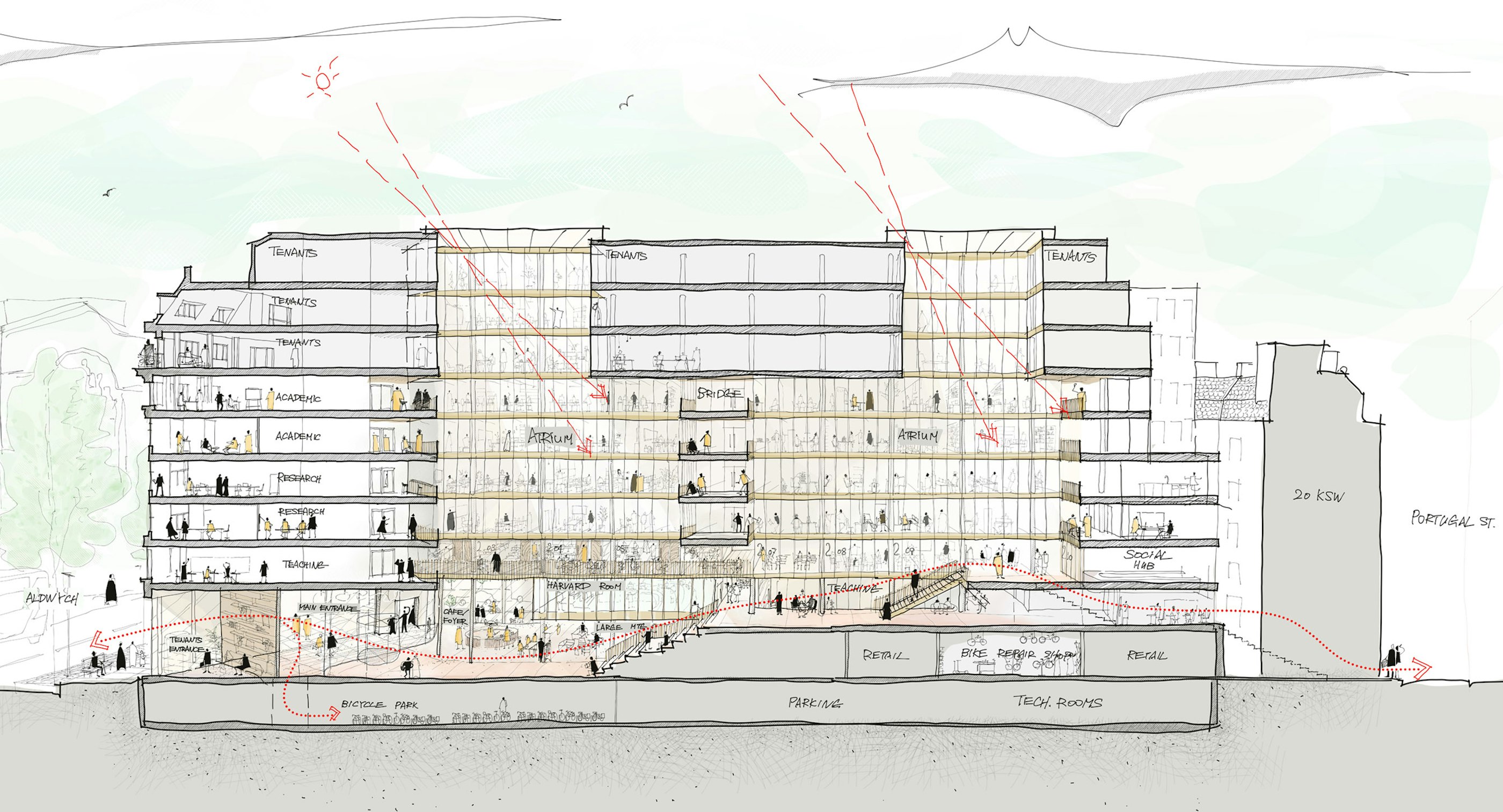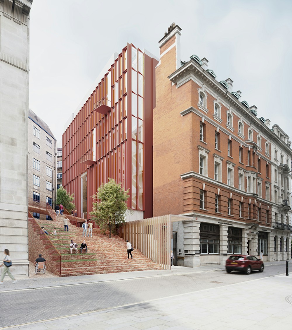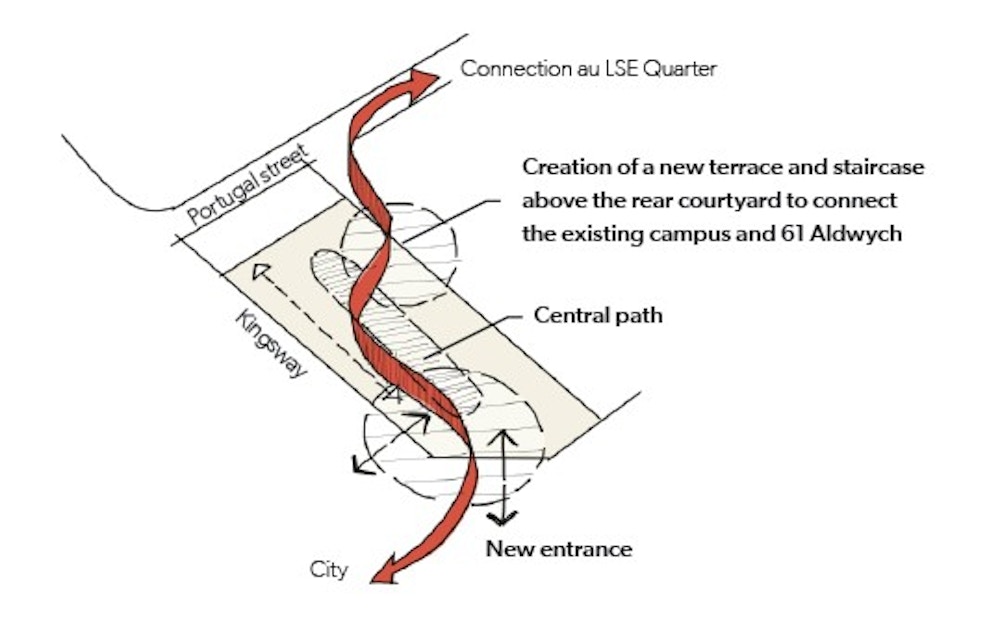 The proposed direct connection from Portugal Street through the new terrace and staircase above the rear courtyard enabled 61 Aldwych to serve as a bridge between the city and the historic campus, providing a pathway that traverses the building.
