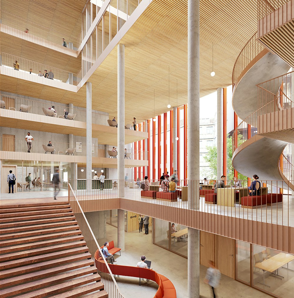 - The connection of two small atriums to increase natural light right into the heart of the building and connect all levels visually and physically to encourages informal interactions. Stairs and bridges create a natural path throughout this central hub.