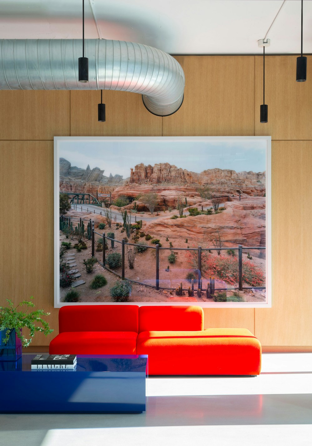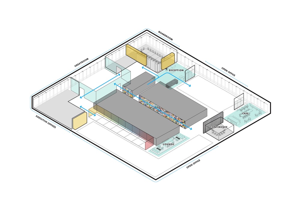 Occupying a single floor proved to be a design advantage and challenge—creating areas that feel distinct from each other yet free-flowing and cohesive within the continuous column-free space. STUDIOS’ solution sets up a series of architectural transitions—partitions of different materials and opacities and various ceiling interventions at varying heights—between the individual program elements to mark thresholds. As one travels around the floor the subtle changes transport you from open office to cafe to executive offices—all with their own unique feel, but understood within the same architectural framework. The board room has a more polished aesthetic while the open office of the finance/technology group has bold colorful accents and the management office, quiet and refined.