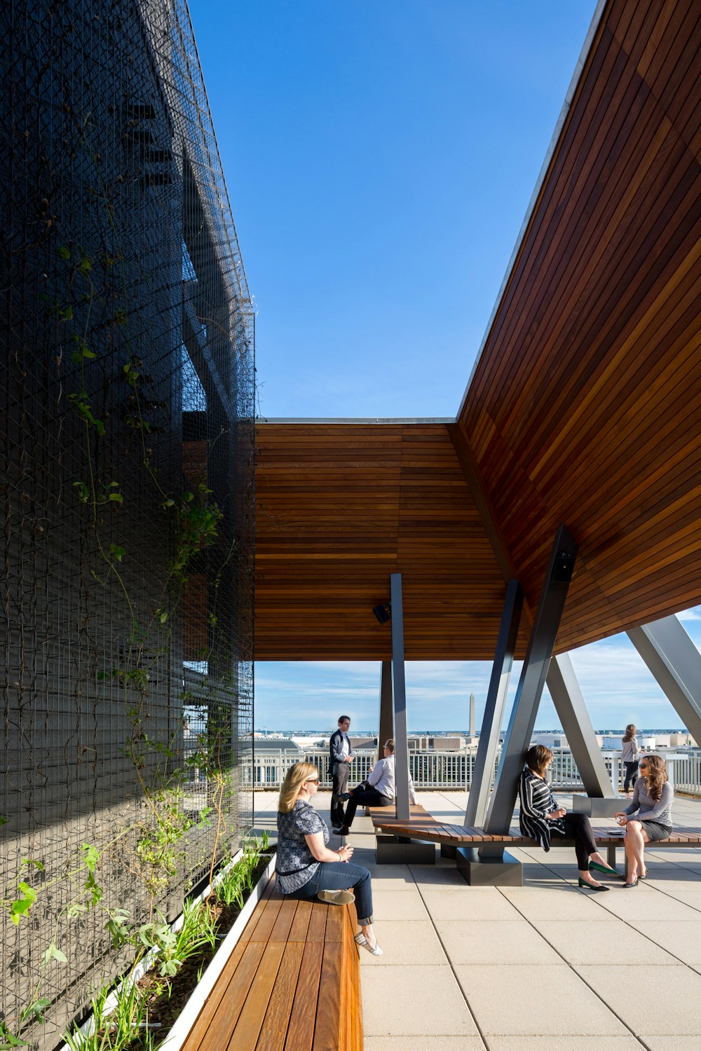 STUDIOS sought to reprogram the east and west penthouses with amenity conference and social lounge spaces imagined as an extension of the tenant’s lease areas. Along with reprogramming the penthouse spaces the existing roof terraces were reconceptualized to be transformed from utilitarian service spaces into a tenant amenity with outdoor terrace with casual seating and wood screens, a green wall and creative lighting.