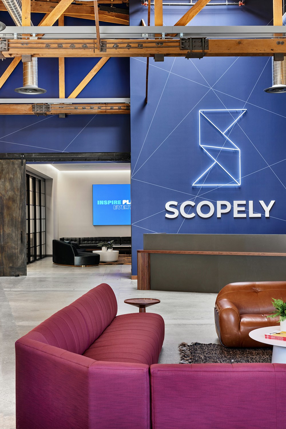 STUDIOS developed a sleek, open design to showcase the 1948 building’s double-height volume and striking bow truss structure, creating a sophisticated, media-rich new headquarters that celebrates gaming company Scopely’s motto: Seize the Play. The key challenges for this project were twofold: designing thoughtful, branded spaces for an ever-evolving program and expanding employee base, and creating a modern workplace within a historic building full of charm and infrastructure challenges.
