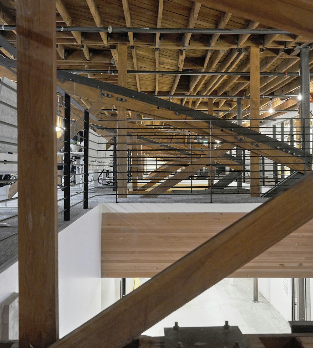 To celebrate the distinctive geometry and character of the wooden trusses, we spent considerable time coordinating the clean-up of all open ceilings, lighting, ductwork, and conduits. We coordinated with the building owner on the mezzanine level to ensure the necessary square footage, and worked around the trusses to create work zones and enclosed meeting spaces within the airy, loft-like space. Two new open stairs connect the mezzanine to the all-hands area, and a central pantry and team lounge.