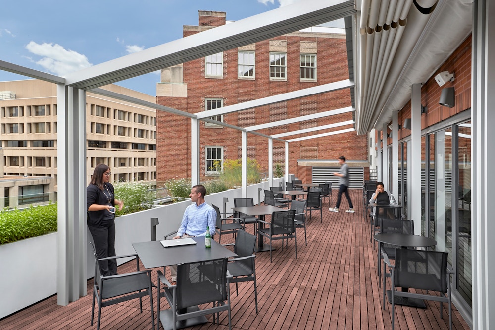 A state-of-the-art café outfitted in stainless steel and warm woods serves employees and enables the company to host large events. The café features an additional outdoor deck completed with an automatic shade system for DC’s rainy season. On the roof deck you’ll not only be greeted with a soft putt-putt corner, but also one of the best views DC has to offer.