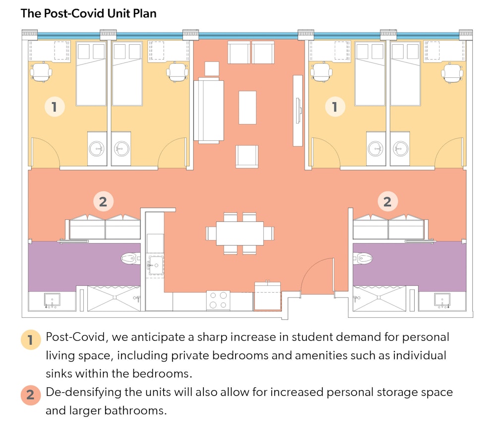 In recent years, the demand for student housing has increased as affordable options—particularly in urban areas—have become harder to find. Many campuses have launched major housing development campaigns, sometimes allotting up to four beds per room in an attempt to meet the demand. However in a post-Covid world, students may feel less comfortable sharing their bedrooms.